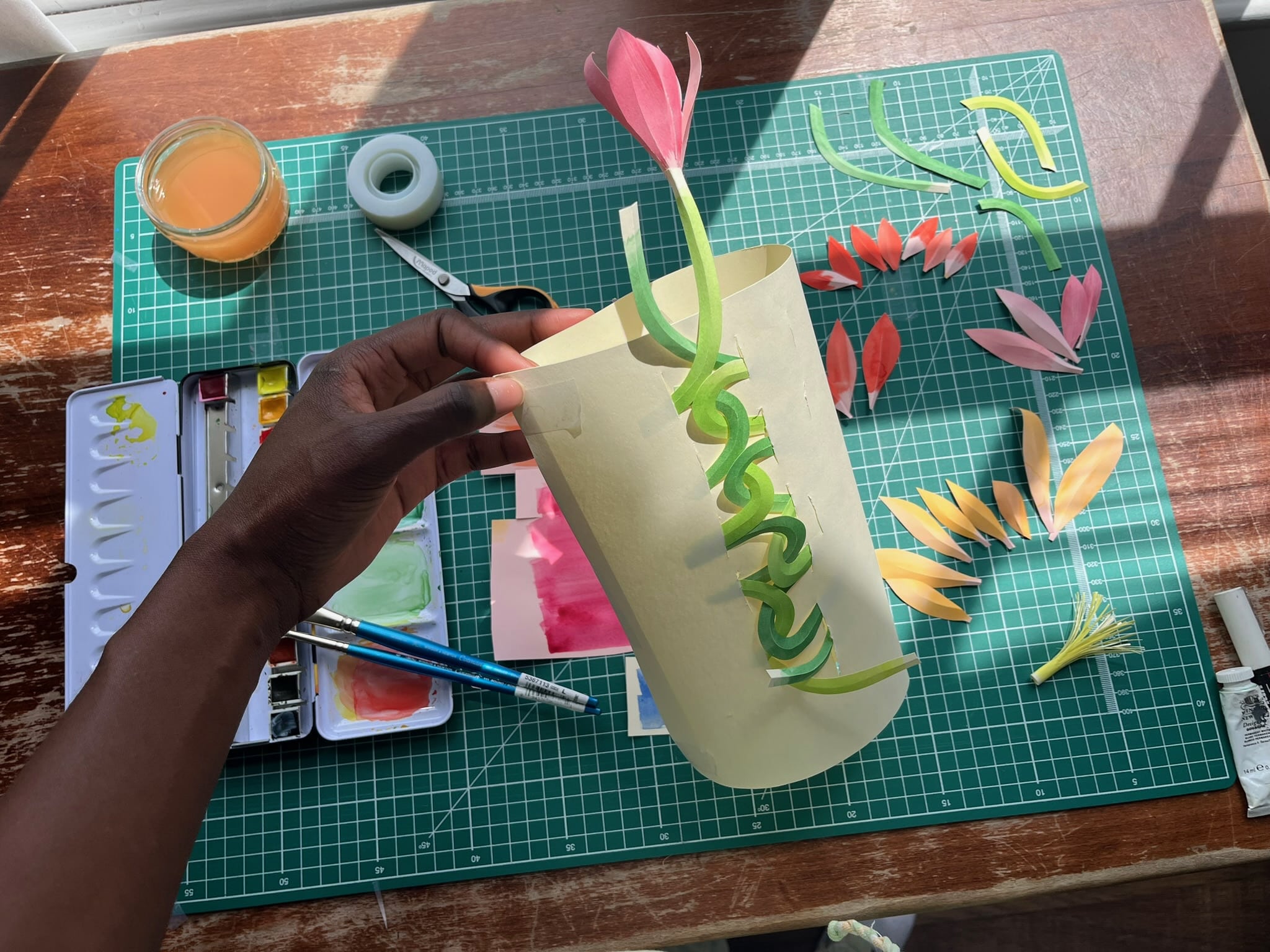 For the project with Lessebo Paper, Tinaye worked with Lessebo Colours and Lessebo Design to shape a floral artwork that emerges from a cylindrical paper form. Using shades such as Ivory 1539, Vanilla 5012, Blossom 3325 and Amazon 9065, she allowed light and shadow to interact with the layered paper, giving the flowers a vibrant almost living presence.